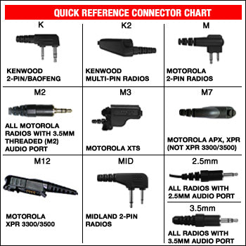 Acoustic Tube Earpiece with 14" or 26" cord and 2.5mm, 3.5mm and a threaded 3.5mm (M2) connector for any radio or remote microphone with a 2.5 mm, 3.5 mm, or threaded 3.5mm earphone jack. 2.5mm is used on most Kenwood Brand Shoulder Mics. 3.5mm is used on many devices including most Motorola Shoulder Mics. The threaded M2 is used on some Motorola radios and adapters.
